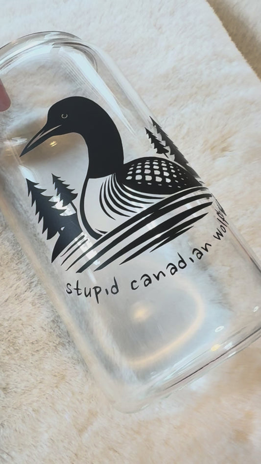 Glass Can Cup 16oz - Stupid Canadian Wolf Bird