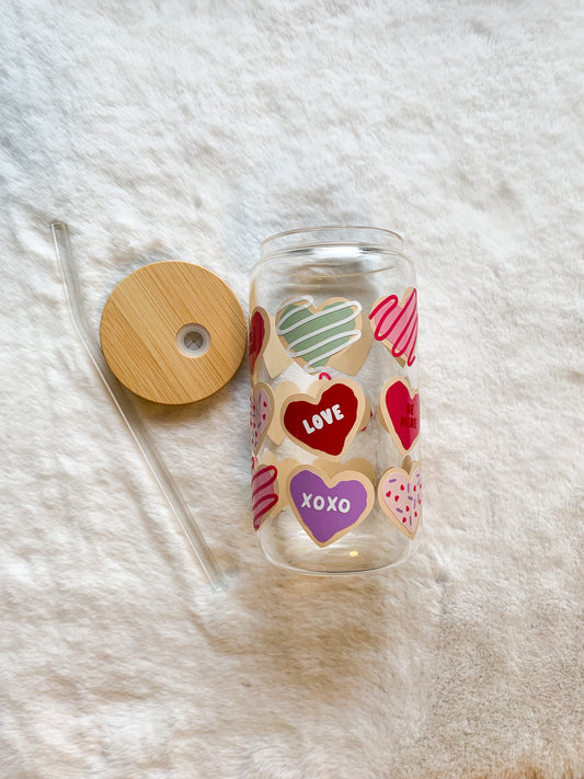 Glass Can Cup 16oz - Cookie Hearts Valentines Day Edition