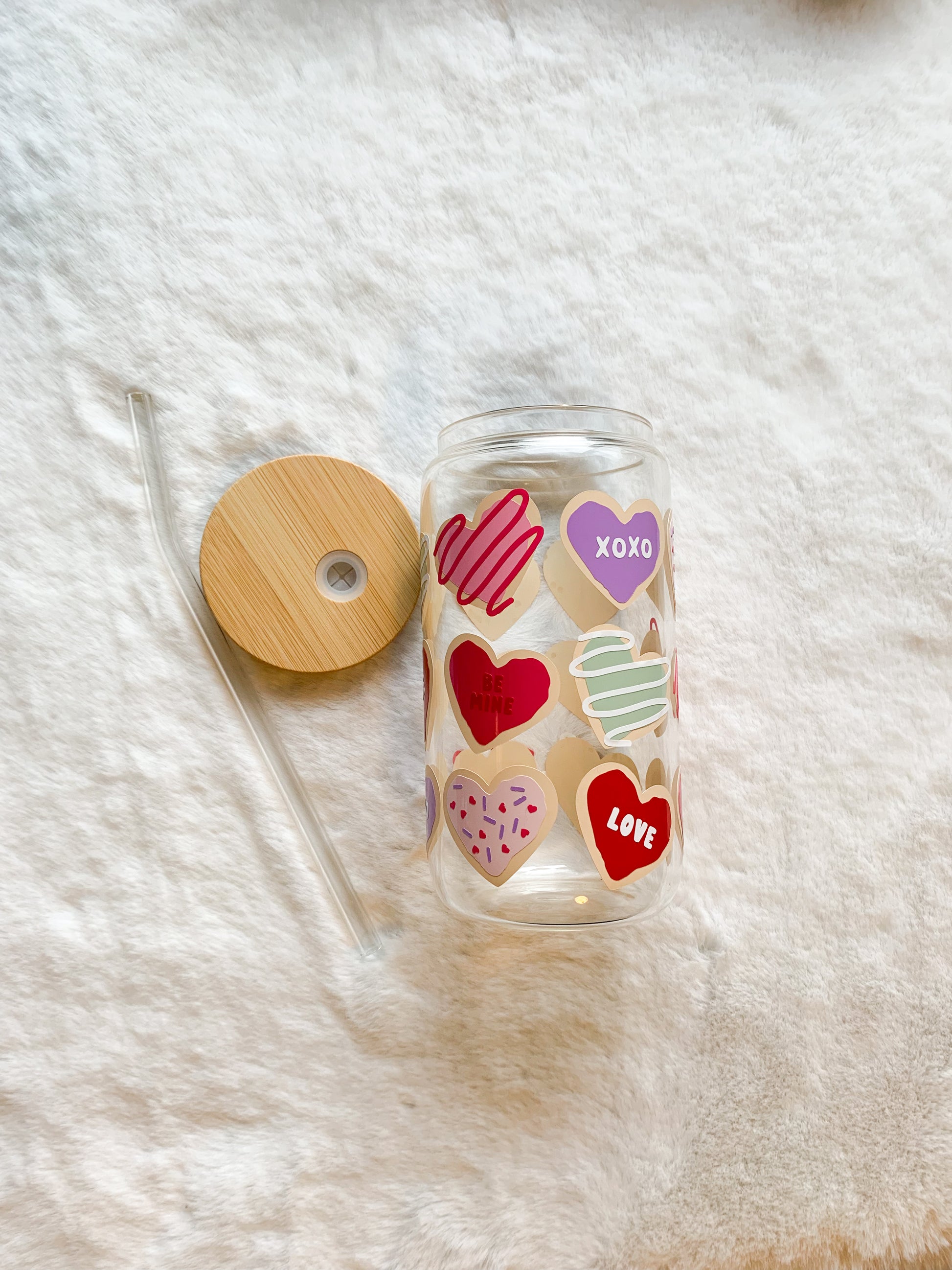 Glass Can Cup 16oz - Cookie Hearts Valentines Day Edition