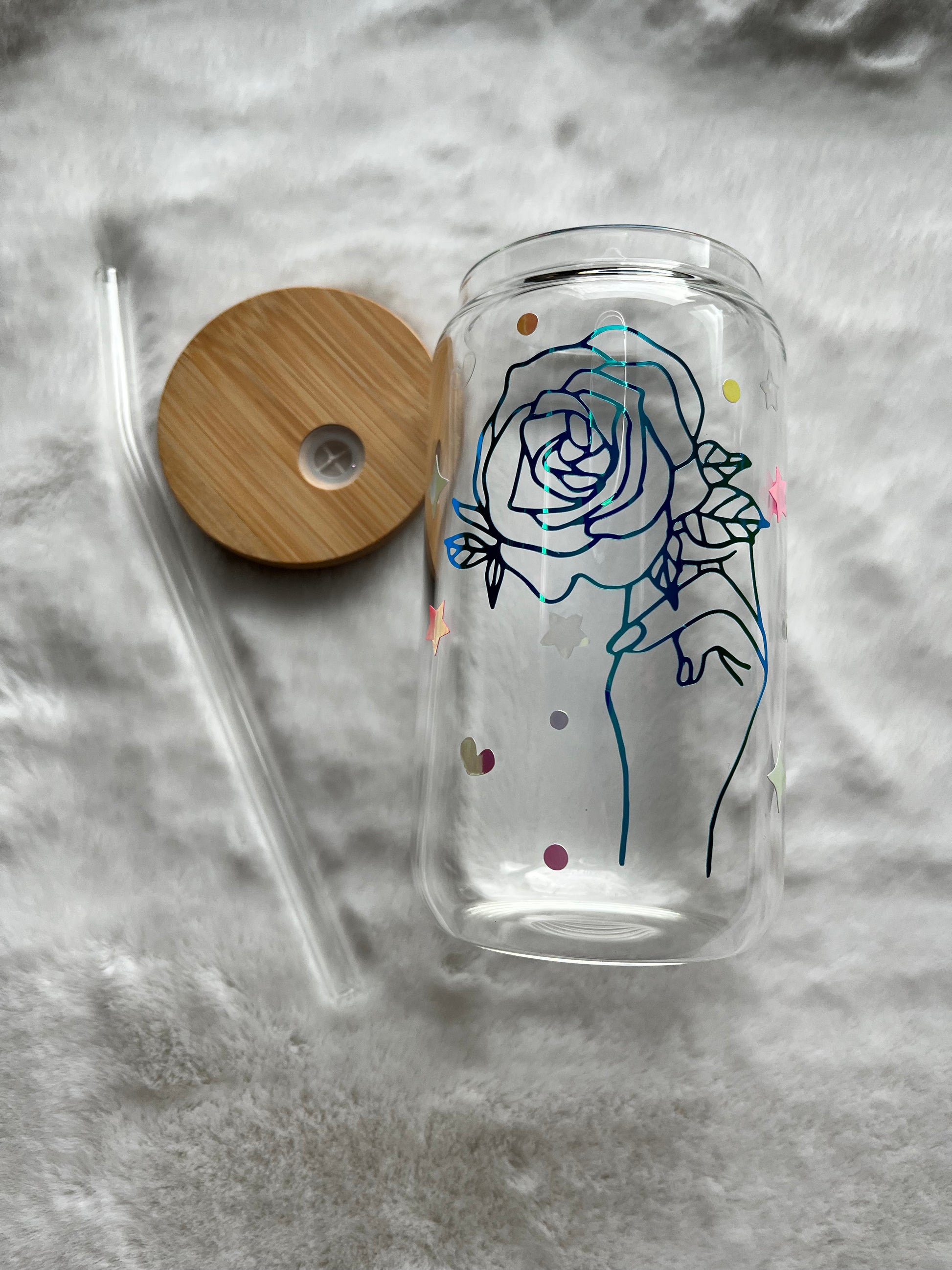 Glass Can Cup 16oz - Holographic Rose in Hand