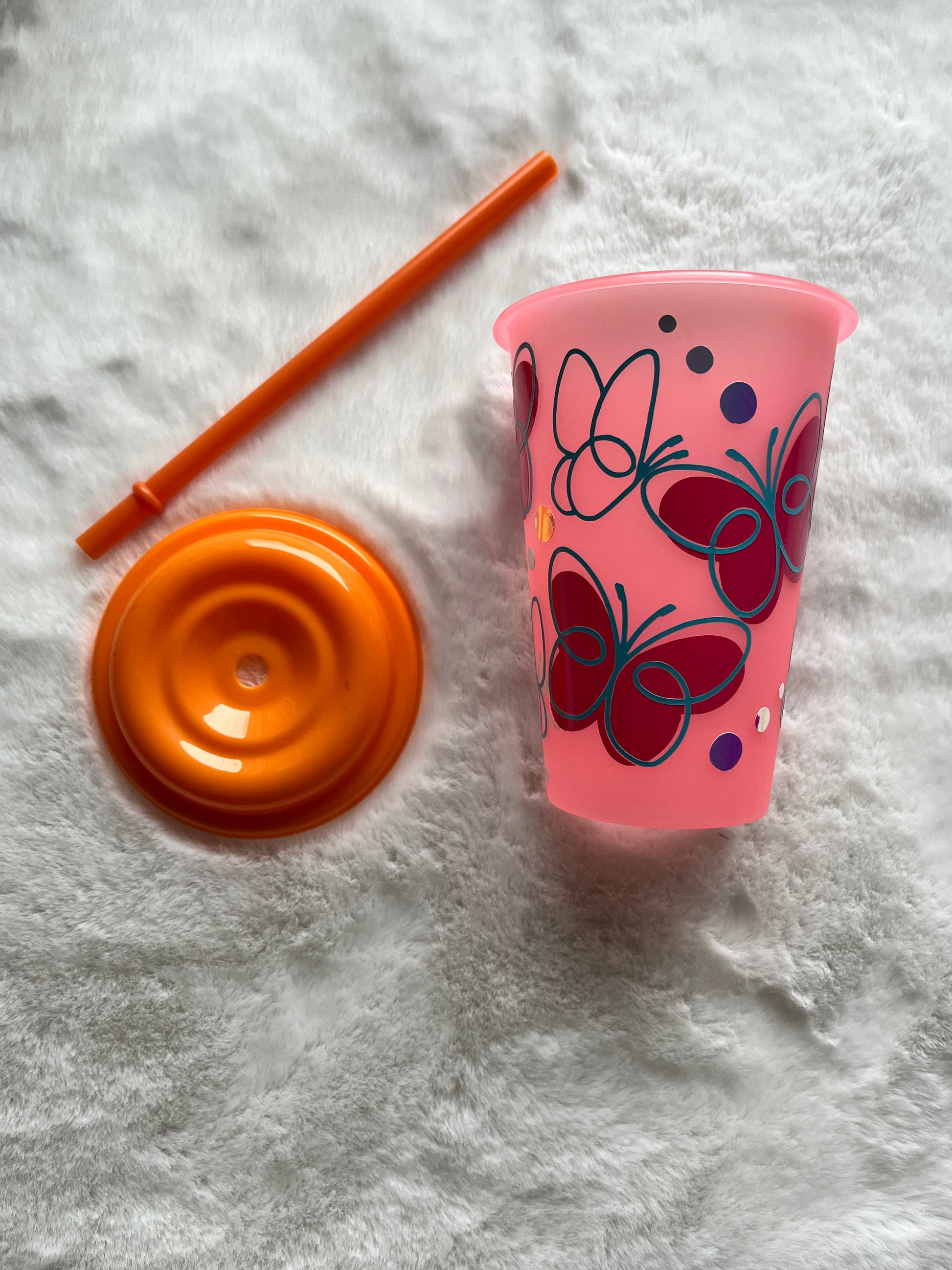A fun drink cup just for the kids! These plastic 12oz cups come with a reusable plastic straw and snap-on lid. Decals are done with the highest-quality adhesive vinyl. Hand wash only; do not soak. Cold drinks only.
